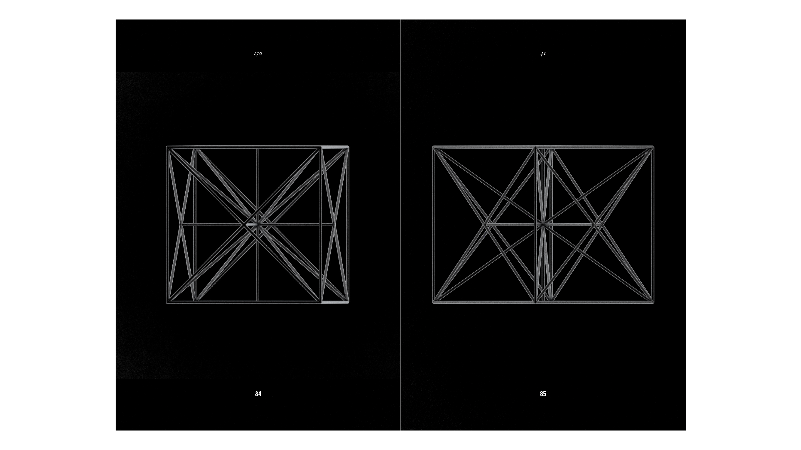 In the publication, recto pages contain each frame of a 360-degree (clockwise in the x-axis) rotation (animated at 30 frames/sec) of a stellated tetrahedron inscribed in a cube. The verso pages contain the same rotation but with frames presented out of sequence. The "reader" moves smoothly through the rotation on the right, with frames appearing in an orderly way, while the rotation on the left progresses by fits and starts, as each frame is disconnected from one that came before and the one that follows. The tetrahedron appears simultaneously to be "in" and "out" of time.