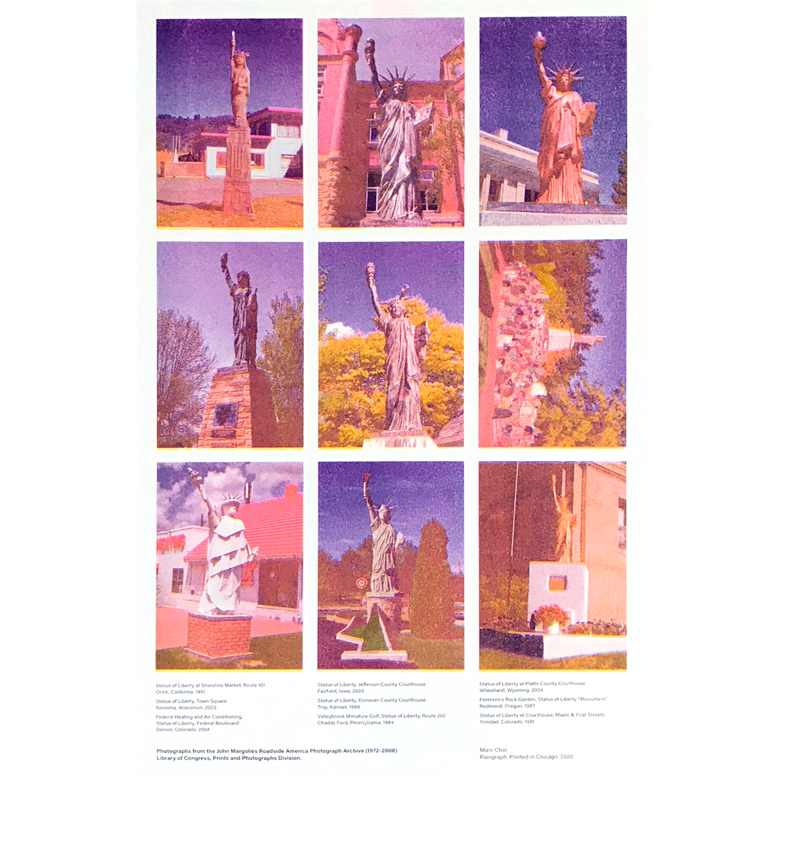 by Marc Choi3-color print reproductions of photographs featuring different versions of the Statue of Liberty found across the United States. The original photographs are from the Library of Congress' John Margolies Roadside America Photograph Archive.